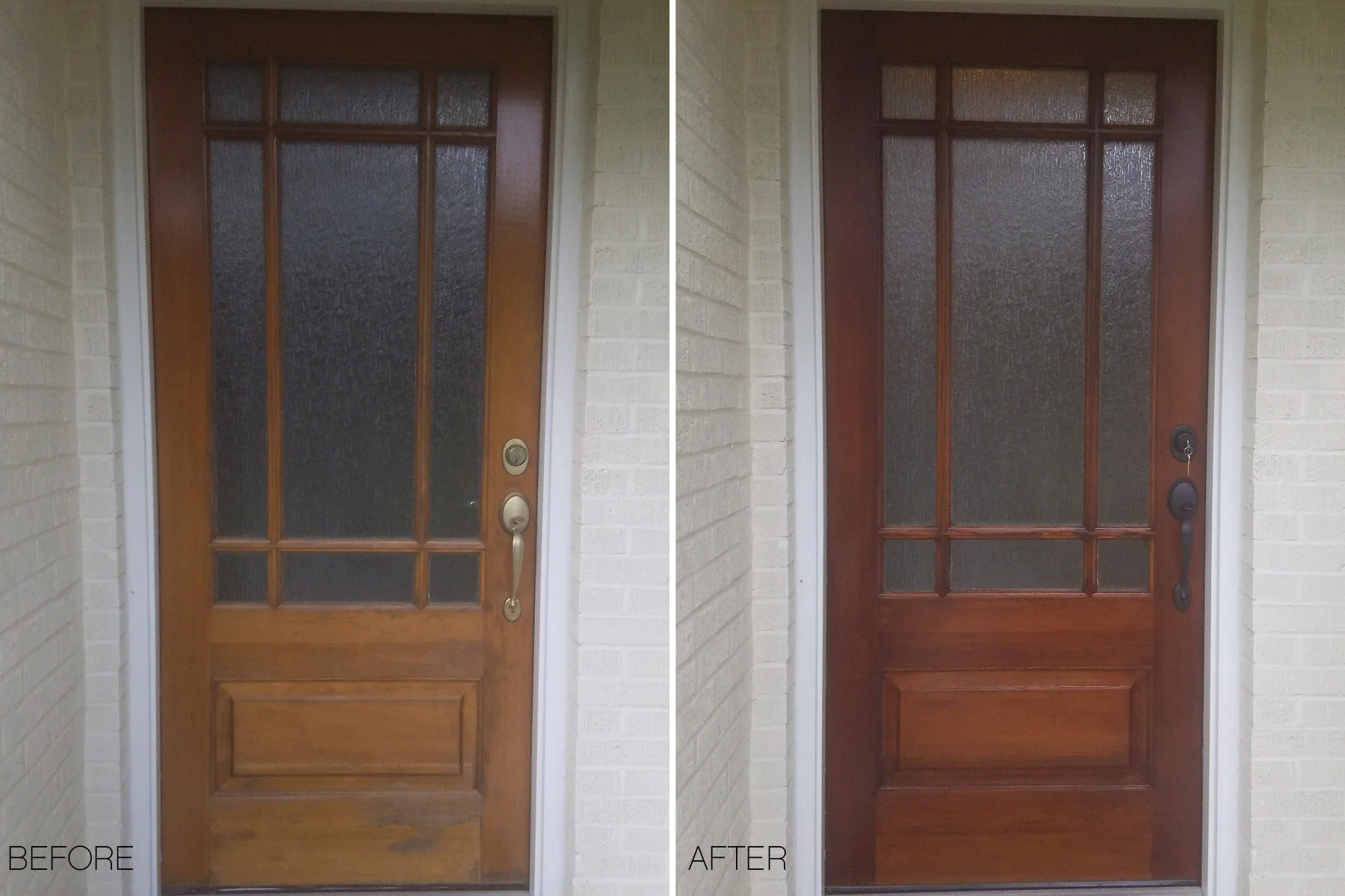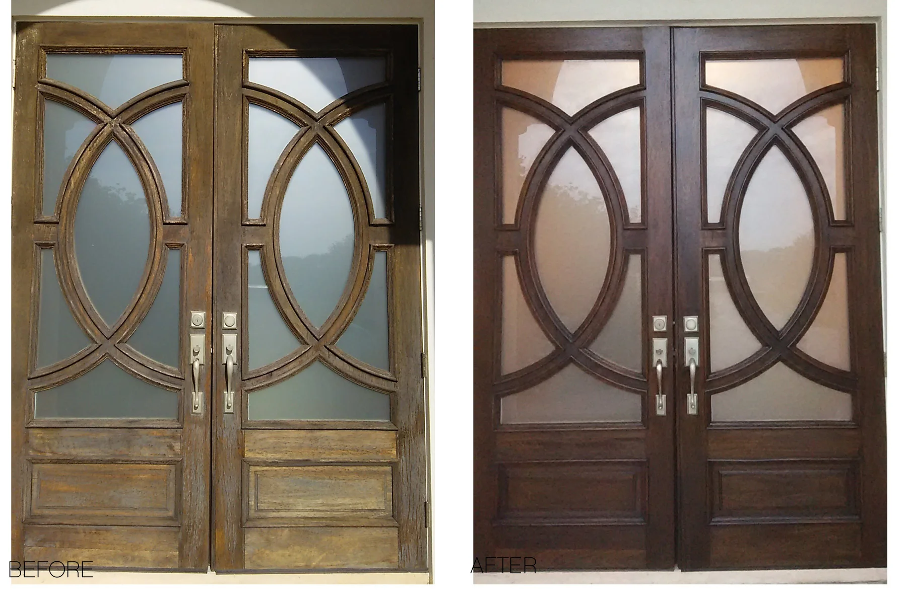 There is a difference between Re-conditioning and Refinishing! Our homeowners realize that stripping the finish off and refinishing a wood door is a time consuming and expensive process. This is why they hire and trust us.